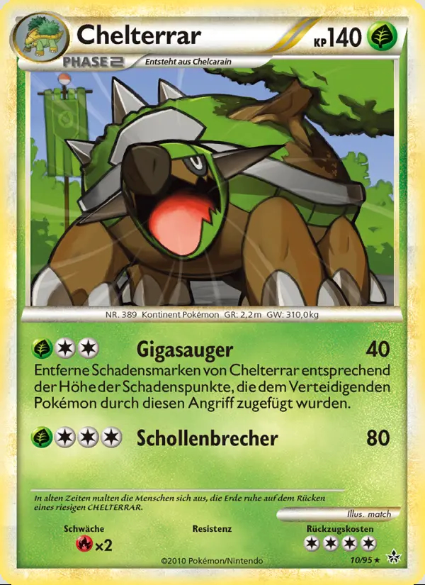 Entferne Schadensmarken von Chelterrar entsprechend der Höhe der Schadenspunkte, die dem Verteidigenden Pokémon durch diesen Angriff zugefügt wurden.