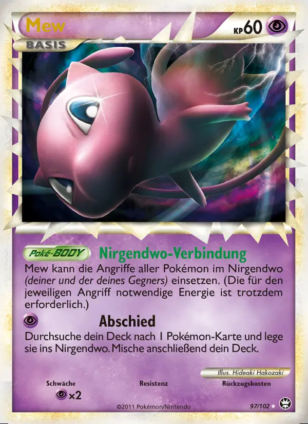 Poké-BODY: Mew kann die Angriffe aller Pokémon im Nirgendwo (deiner und der deines Gegners) einsetzen. (Die für den jeweiligen Angriff notwendige Energie ist trotzdem erforderlich.)