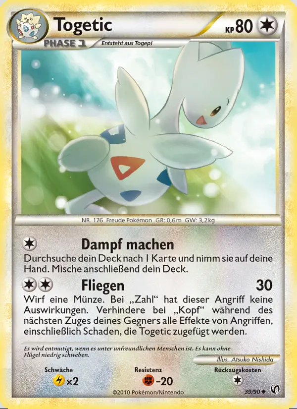 Wirf eine Münze. Bei "Zahl" hat dieser Angriff keine Auswirkungen. Verhindere bei "Kopf" während des nächsten Zuges deines Gegners alle Effekte von Angriffen, einschließlich Schaden, die Togetic zugefügt werden.