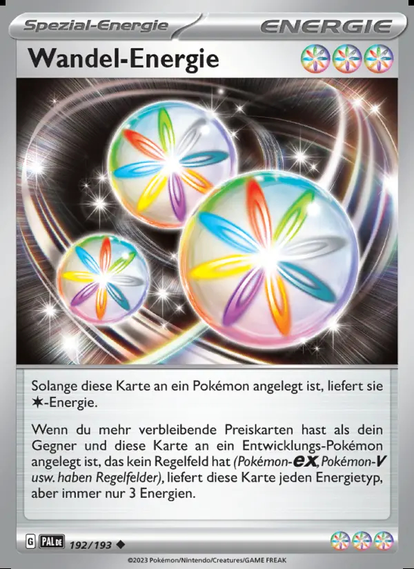 Solange diese Karte an ein Pokémon angelegt ist, liefert sie {C}-Energie. Wenn du mehr verbleibende Preiskarten hast als dein Gegner und diese Karte an ein Entwicklungs-Pokémon angelegt ist, das kein Regelfeld hat (Pokémon-ex, Pokémon-V usw. haben Regelfelder), liefert diese Karte jeden Energietyp, aber immer nur 3 Energien.