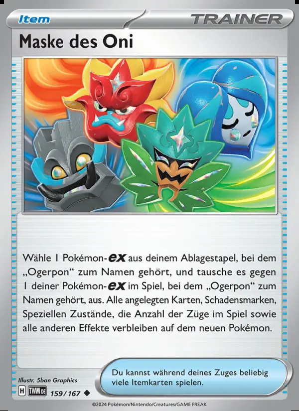 Wähle 1 Pokémon-ex aus deinem Ablagestapel, bei dem "Ogerpon" zum Namen gehört, und tausche es gegen 1 deiner Pokémon-ex im Spiel, bei dem "Ogerpon" zum Namen gehört, aus. Alle angelegten Karten, Schadensmarken, Speziellen Zustände, die Anzahl der Züge im Spiel sowie alle anderen Effekte verbleiben auf dem neuen Pokémon.