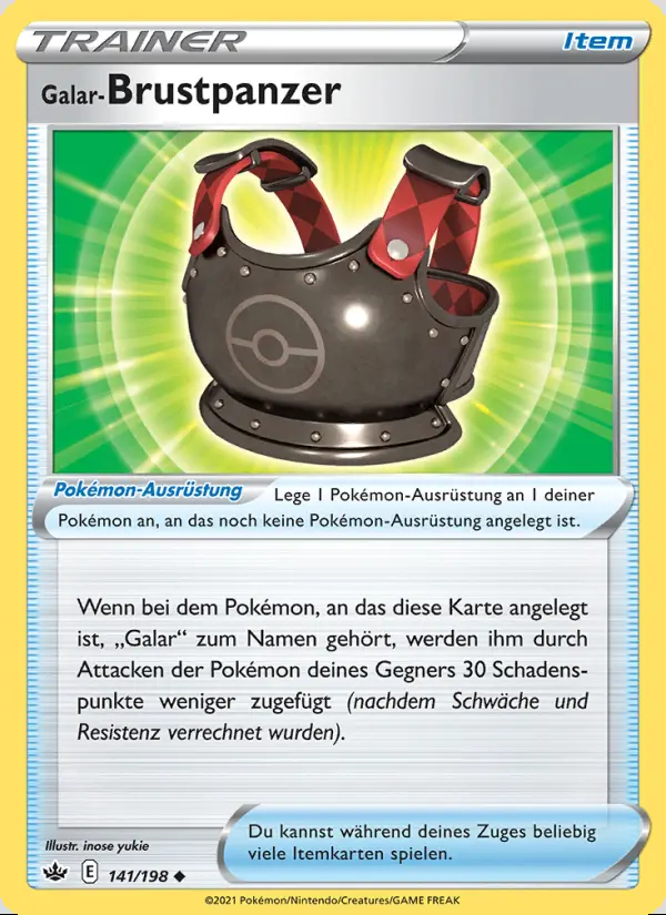 Wenn bei dem Pokémon, an das diese Karte angelegt ist, "Galar" zum Namen gehört, werden ihm durch Attacken der Pokémon deines Gegners 30 Schadenspunkte weniger zugefügt (nachdem Schwäche und Resistenz verrechnet wurden).