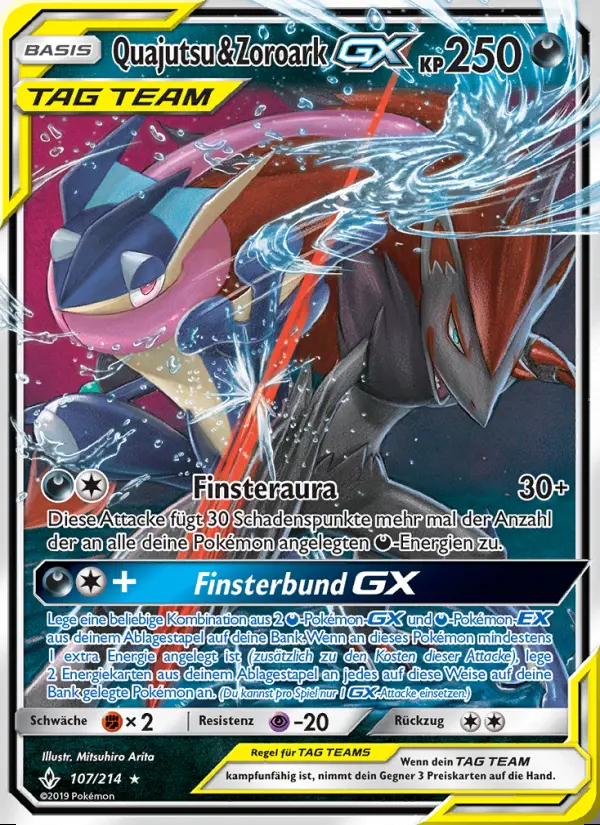 Lege eine beliebige Kombination aus 2 Darkness-Pokémon-GX und Darkness-Pokémon-EX aus deinem Ablagestapel auf deine Bank. Wenn an dieses Pokémon mindestens 1 extra Energie angelegt ist (zusätzlich zu den Kosten dieser Attacke), lege 2 Energiekarten aus deinem Ablagestapel an jedes auf diese Weise auf deine Bank gelegte Pokémon an. (Du kannst pro Spiel nur 1 GX-Attacke einsetzen.)