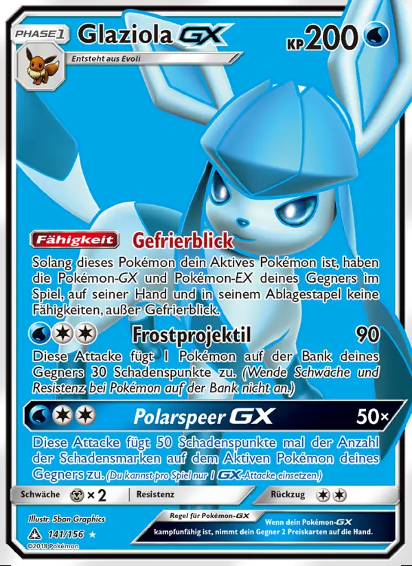Fähigkeit: Solang dieses Pokémon dein Aktives Pokémon ist, haben die Pokémon-GX und Pokémon-EX deines Gegners im Spiel, auf seiner Hand und in seinem Ablagestapel keine Fähigkeiten, außer Gefrierblick.