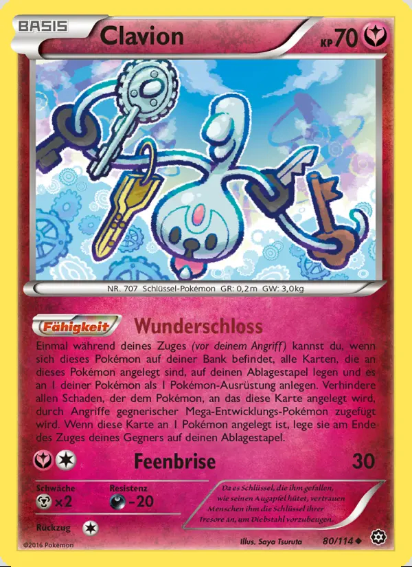 Fähigkeit: Einmal während deines Zuges (vor deinem Angriff) kannst du, wenn sich dieses Pokémon auf deiner Bank befindet, alle Karten, die an dieses Pokémon angelegt sind, auf deinen Ablagestapel legen und es an 1 deiner Pokémon als 1 Pokémon-Ausrüstung anlegen. Verhindere allen Schaden, der dem Pokémon, an das diese Karte angelegt wird, durch Angriffe gegnerischer Mega-Entwicklungs-Pokémon zugefügt wird. Wenn diese Karte an 1 Pokémon angelegt ist, lege sie am Ende des Zuges deines Gegners auf deinen Ablagestapel.
