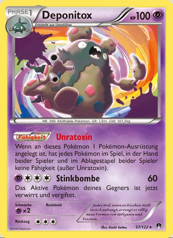 Fähigkeit: Wenn an dieses Pokémon 1 Pokémon-Ausrüstung angelegt ist, hat jedes Pokémon im Spiel, in der Hand beider Spieler oder im Ablagestapel beider Spieler, keine Fähigkeit (außer Unratoxin).